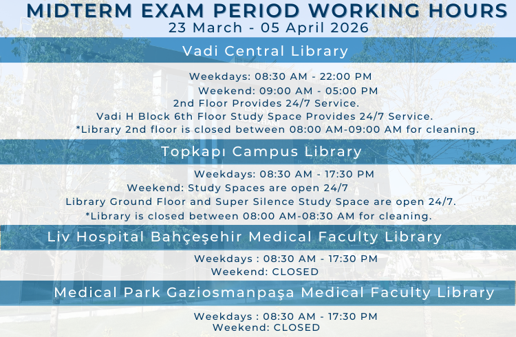 Çalışma Saatien 18 Mar Important Announcement | About Library Working Hours 17 Mar Announcement | Trial Access CINAHL Ultimate 17 Mar Announcement | Trial Access Applied Science & Technology Source Ultimate 17 Mar Announcement | Trial Access Dentistry & Oral Sciences Source 17 Mar Announcement | Trial Access MEDLINE Ultimate LIB GUIDES New Books Your browser does not support iframes, but you can visit