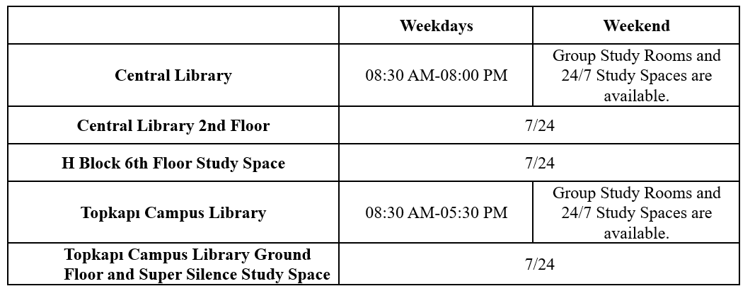 *The Topkapı Campus Library will be closed from 8:00 AM to 8:30 AM for cleaning.