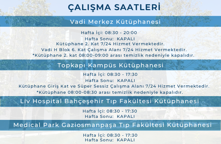 Çalışma Saatleri 18 Mar Önemli Duyuru | Kütüphane Çalışma Saatleri Hakkında 17 Mar Duyuru | Deneme Erişimi CINAHL Ultimate 17 Mar Duyuru | Deneme Erişimi Applied Science & Technology Source Ultimate 17 Mar Duyuru | Deneme Erişimi Dentistry & Oral Sciences Source 17 Mar Duyuru | Deneme Erişimi MEDLINE Ultimate KÜTÜPHANE HİZMETLERİ Yeni Gelenler Your browser does not support iframes, but you can visit