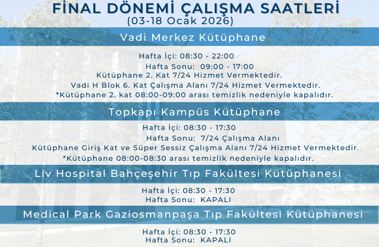 Çalışma Saatleri 31 Ara Önemli Duyuru | Kütüphane Çalışma Saatleri Hakkında 30 Ara Önemli Duyuru | Kütüphane Çalışma Saatleri Hakkında 2 Ara Duyuru | Kütüphanelerin Dijital Sesi: Sosyal Medya ile Görünürlük ve Etkileşim 19 Kas Duyuru | Akademik Dergilerde Etkili Yayın Yapma Stratejileri ve İpuçları 13 Kas PISA Başarısının Gizli Anahtarı : Kütüphaneciler ve Eleştirel Bilgi Okuryazarlığı KÜTÜPHANE HİZMETLERİ Yeni Gelenler Tüm Yeni Gelen Kitaplar Harry Potter ve Melez Prens Şafakta verilmiş sözüm vardı Osmanlı arapları : hilafet - siyaset - milliyet 1798-1918 Simülakrlar ve simülasyon