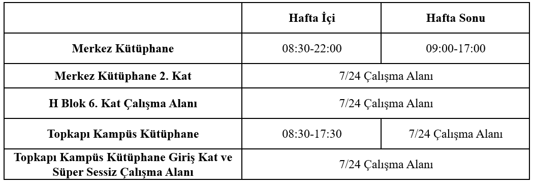 Merkez Kütüphane 2. Kat, Vadi H Blok 6. Kat ve Topkapı Kütüphane giriş kat ve süper sessiz çalışma alanları ile grup çalışma odaları 7/24 hizmet vermeye devam edecektir.